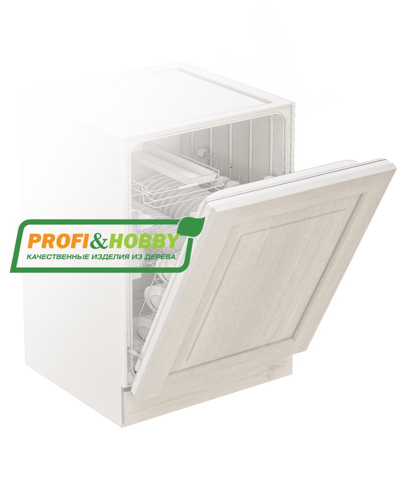 Фасад для посудомоечной машины шириной 60 см, изготовлен из 100% массива дерева, без шпона и без МДФ/ДСП. Поверхность изделия отшлифована и покрыта бесцветным акриловым лаком.