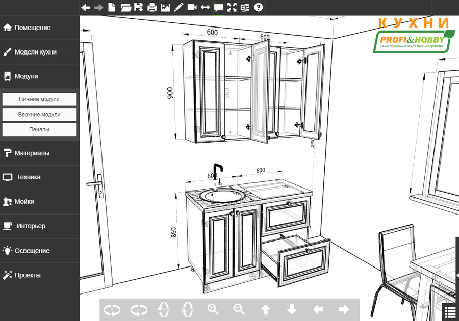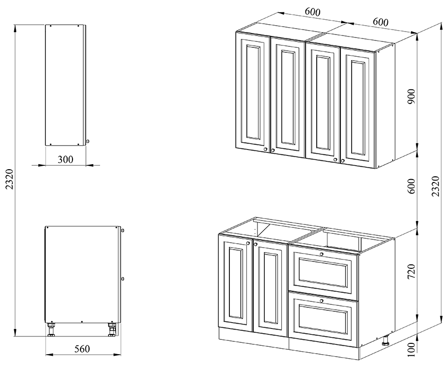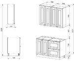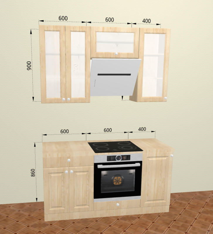 Благодаря модульной системе такая кухня может быть собрана зеркально, а, например, верхние шкафчики “под стекло” и “глухие” заменены местами. В стандартной комплектации нижние тумбы оснащены регулируемыми ножками высотой 100 мм и цоколем из массива сосны высотой 95 мм.