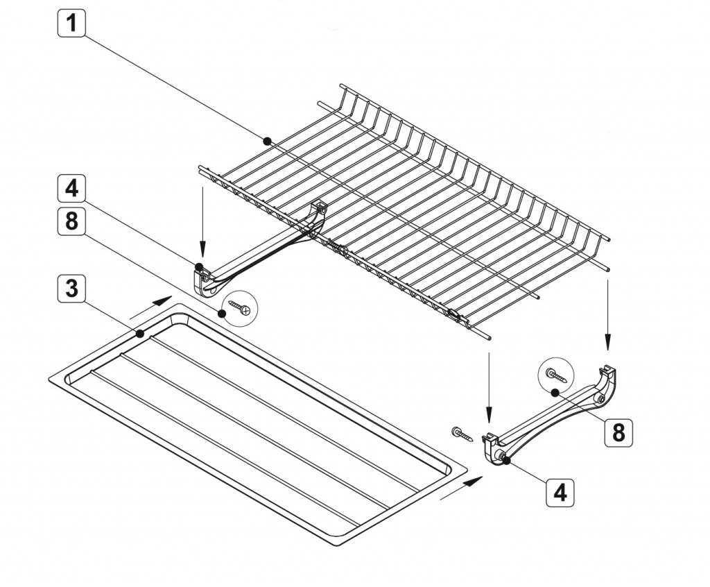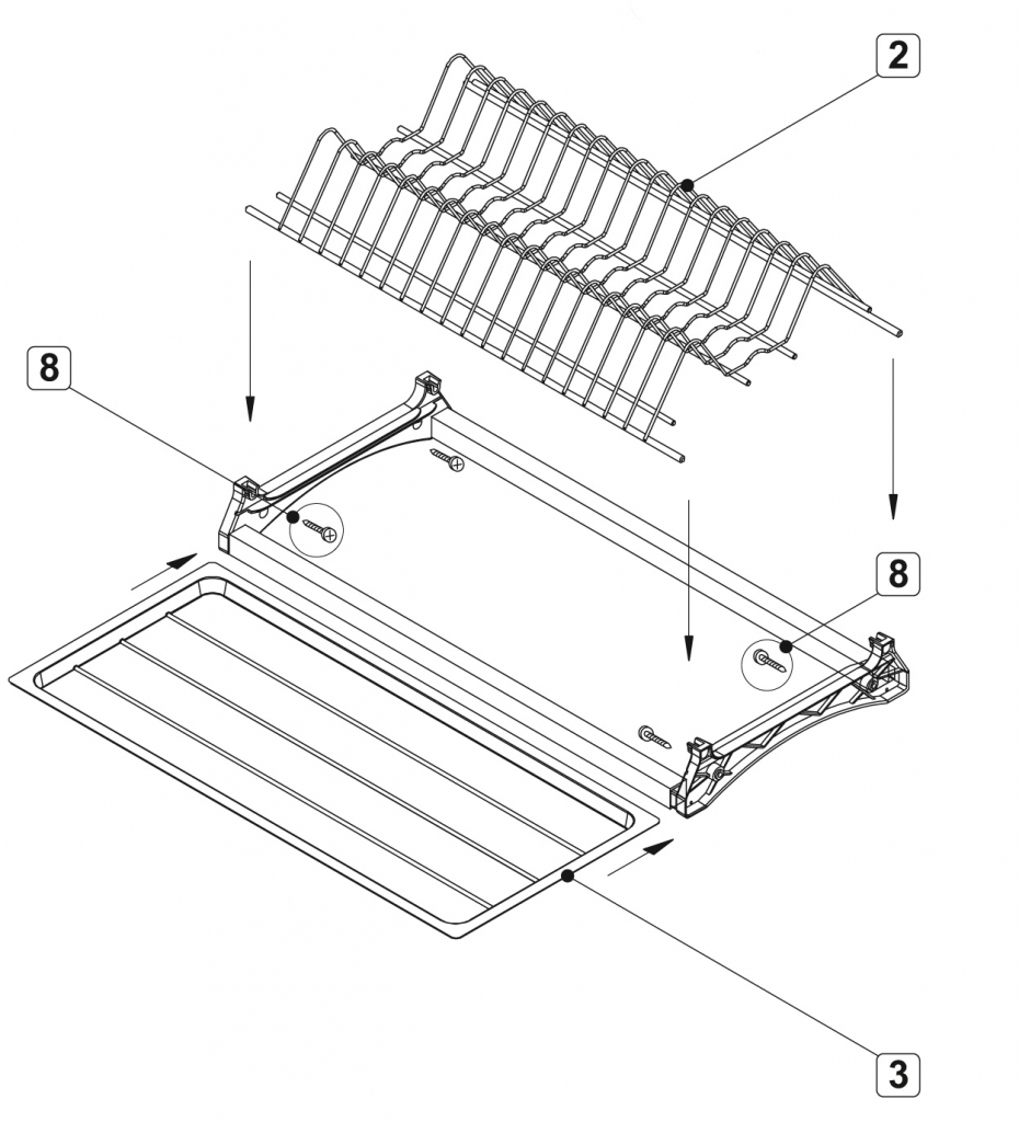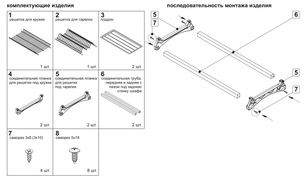 Комплект сушки включает 2 яруса для хранения посуды с надёжным гальваническим покрытием с эффектом хромирования, 2 съёмных поддона из качественного бесцветного пластика, 4 пластиковых серых держателя нижнего и верхнего уровней, переднюю и заднюю алюминиевые трубки, саморезы для монтажа сушки и крепления трубки.