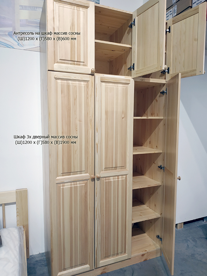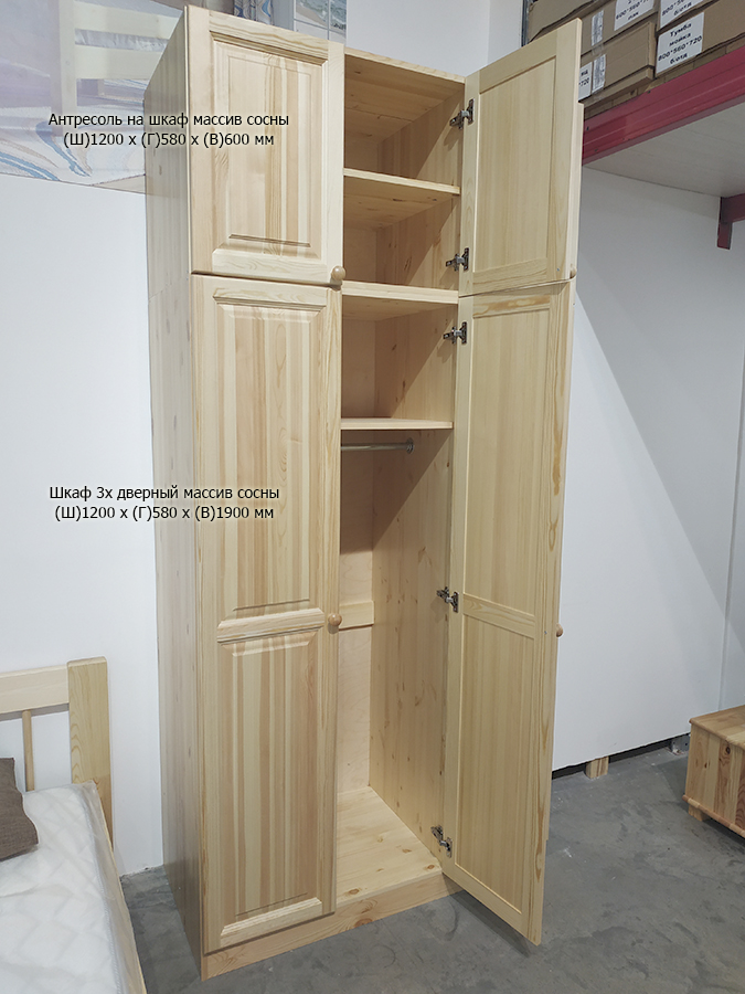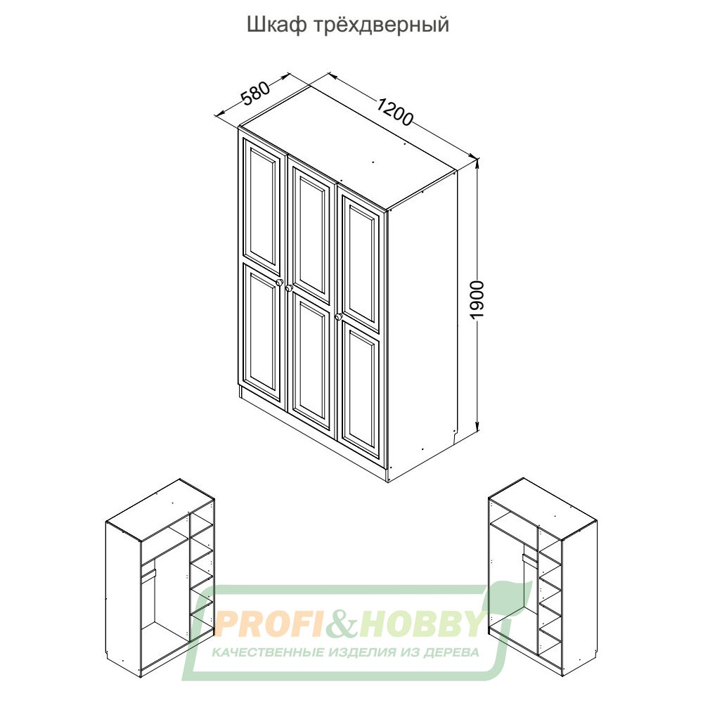 Шкаф трехдверный Profi&Hobby серии Классика изготовлен из сосны без покраски, размеры (ШхГхВ) 1200х580х1900 мм. Задняя стенка из берёзовой фанеры. Поставляется в разобранном виде.
